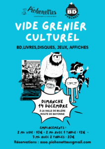 Avis aux passionnés de culture et de belles trouvailles ! Le vide-grenier culturel de Pichenettes revient le dimanche 14 décembre à la Halle de Billère. BD, livres, disques, jeux, affiches… c’est l’occasion parfaite de chiner ou de vider vos étagères. Réservez vite votre stand !
